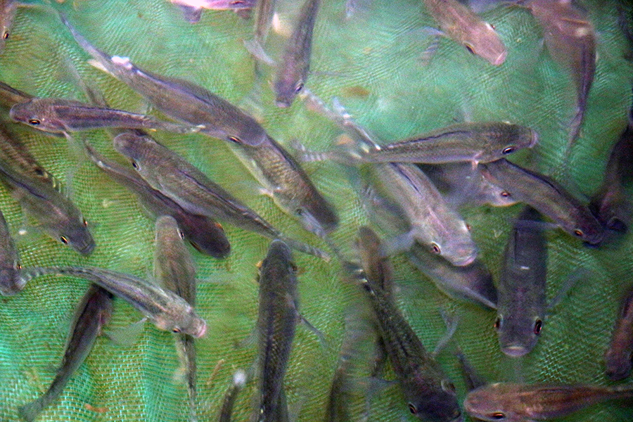 Se trasporta en bolsas de 1000 hacia la presa, luego se colocan en jaulas con mallas de media pulgada donde se puede meter de 8,000 a 12,000. Una vez ahí se comienzan a alimentar los primeros quince días de migaja, luego 15 días alimento 1.5, luego de 2.,5 hasta completar los dos meses se da alimento 3.5 y de 5.5 ya para finalizar.